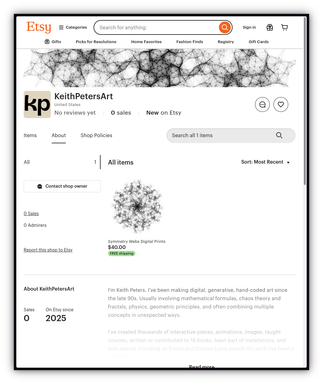 As planned, my print shop is now open for business, taking orders for the five prints in the Symmetry Webs series.
