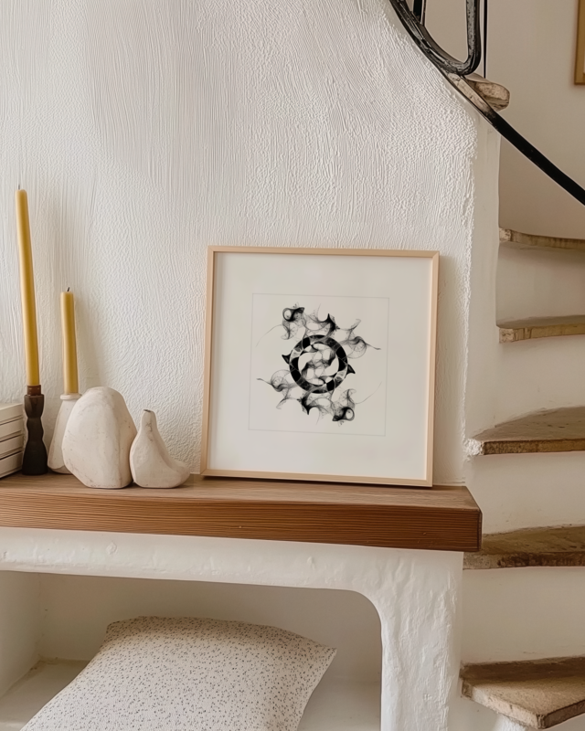 Part of a new series of radial symmetry webs. Particles are allowed to wander, creating organic shapes that repeat at intervals. Each image in the series also incorporates an area of color inversion. Available as an 8x8 inch giclée print on Sunset Cotton Etching paper. Custom sizes may be available on request.