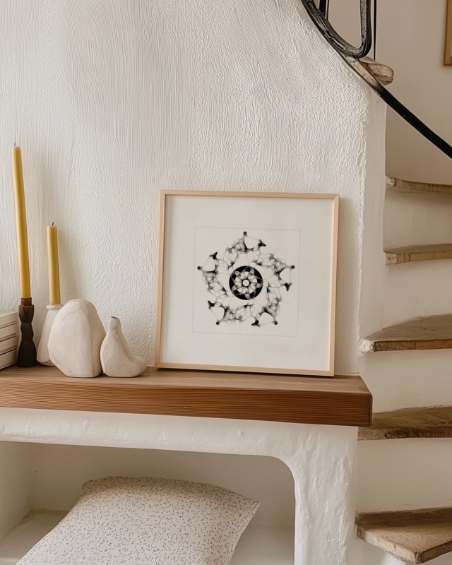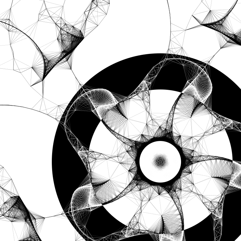 Part of a new series of radial symmetry webs. Particles are allowed to wander, creating organic shapes that repeat at intervals. Each image in the series also incorporates an area of color inversion. Available as an 8x8 inch giclée print on Sunset Cotton Etching paper. Custom sizes may be available on request.