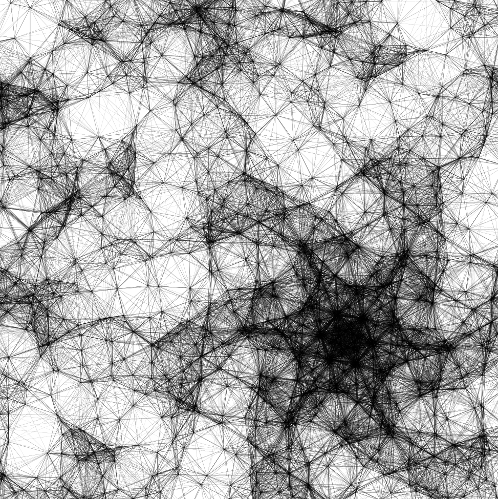 The first in a series of “symmetry webs”. Random particles are repeated at six radial intervals, then joined with proximity webs, creating a fascinating interplay of chaos and order.